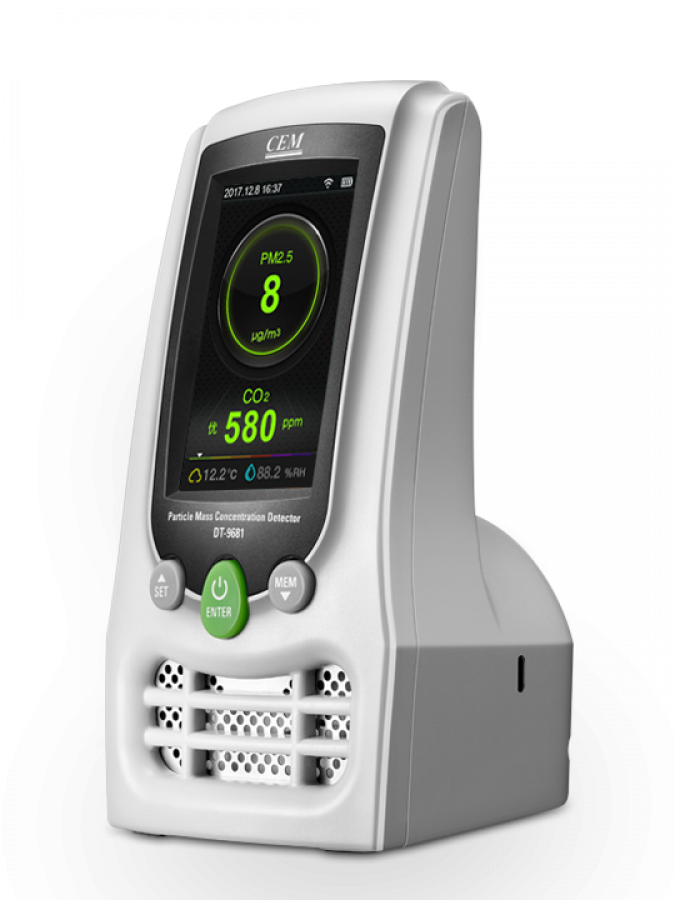 DT-9680 оснащен 3"-дюймовым, цветным TFT ЖК-экраном. Это устройство представляет собой детектор качества воздуха, оснащен несколькими режимами измерений, интеллектуальными функциями и функцией хранения данных в «облаке». Он позволяет определять содержание взвешенных твердых частиц РМ2.5, РМ10, концентрацию углекислого газа, формальдегида и летучих органических соединений. В нем применяется метод взвешенного испытания по рассеянию лазерного излучения.