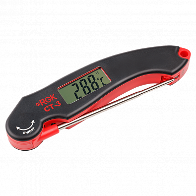 Цифровой термометр RGK CT-3 выполнен в формате складного ножа. Такая конструкция обеспечивает крепкий, надежный хват, а также защищает измерительный щуп. Стальной зонд длиной 100 мм позволяет безопасно проверять температуру горячих блюд, обладает достаточной прочностью для тестирования полутвердых (сыры) и замороженных продуктов. Сенсор в металлическом корпусе водонепроницаем, что дает возможность, например, замерять температуру напитков. Диаметр наконечника составляет 3 мм, благодаря чему взятие проб не портит товарный вид блюда.